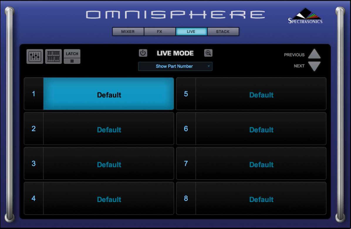 Step 6) In Omnisphere, go to each part (1-8) and select the desired patch for that part. Then go back to Live mode and you should be able to see the parts you selected. I just selected four parts at random. Note that you could have done this step first, preselecting the sounds you want for each part or slot. At this point you may want to save your Omnisphere patch in the usual manner for future use (although Gig Performer should save the entire state anyway)
